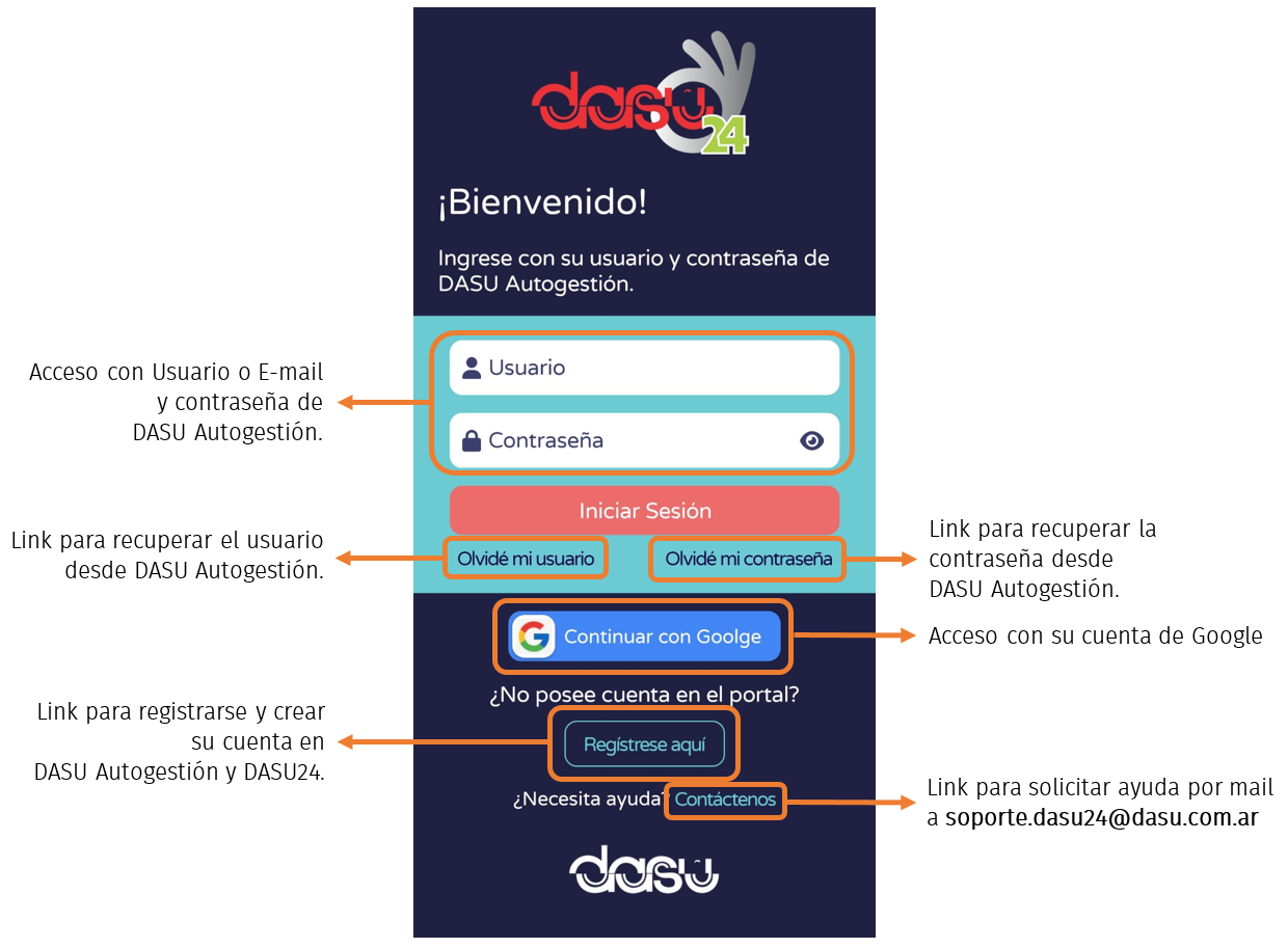 En lugar del usuario puede ingresar su e-mail de registro en DASU Autogestión o utilice la opción dentro de la APP para acceder al formulario de recuperación de usuario o de contraseña.